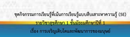ชุดกิจกรรมการเรียนรู้ที่เน้นการเรียนรู้แบบสืบเสาะหาความรู้ (5E) รายวิชาสุขศึกษา 1 ชั้นมัธยมศึกษาปีที่ 1เรื่องการเจริญเติบโตและพัฒนาการของมนุษย์