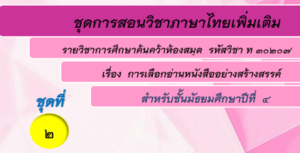 ชุดการสอนวิชาภาษาไทยเพิ่มเติม รายวิชาการศึกษาค้นคว้าห้องสมุด รหัสวิชา ท30207เรื่องการเลือกอ่านหนังสืออย่างสร้างสรรค์ สำหรับชั้นมัธยมศึกษาปีที่ 4