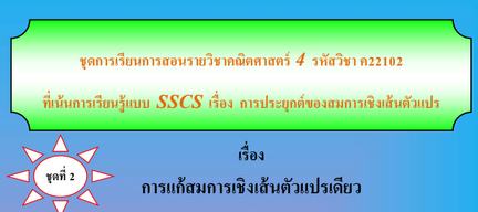 ชุดการเรียนการสอนวิชาคณิตศาสตร์ 4 รหัสวิชา ค22102 ที่เน้นการเรียนรู้แบบ SSCS เรื่อง การประยุกต์ของสมการเชิงเส้นตัวแปรเดียว ส ำหรับนักเรียนชั้นมัธยมศึกษาปีที่ 2
