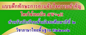แบบฝึกทักษะการอ่านจับใจความสำคัญ โดยใช้เทคนิค ๕w+๑H สำหรับนักเรียนชั้นมัธยมศึกษาปีที่ ๒ วิชาภาษาไทยพื้นฐาน ท๒๒๑๐๒