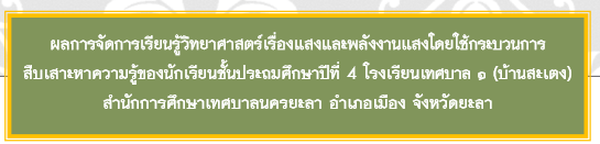 ผลการจัดการเรียนรู้วิทยาศาสตร์เรื่องแสงและพลังงานแสงโดยใช้กระบวนการ สืบเสาะหาความรู้