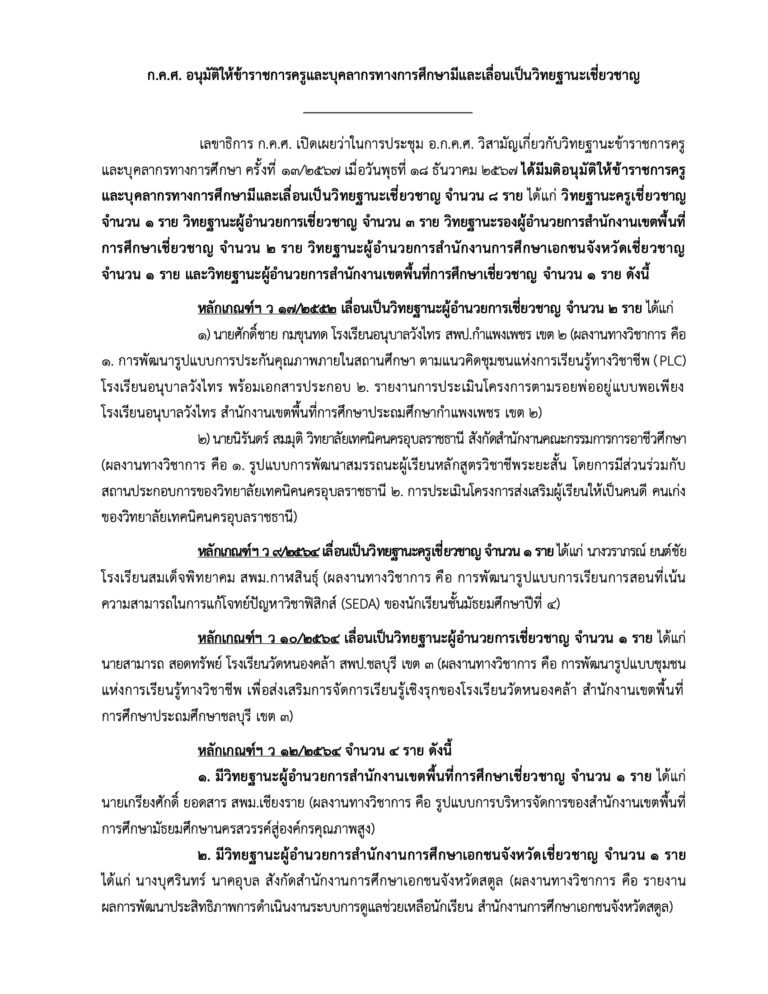 ก.ค.ศ. อนุมัติให้ข้าราชการครูและบุคลากรทางการศึกษามีและเลื่อนเป็นวิทยฐานะเชี่ยวชาญ จำนวน 8 ราย เมื่อวันที่ 18 ธันวาคม 2567