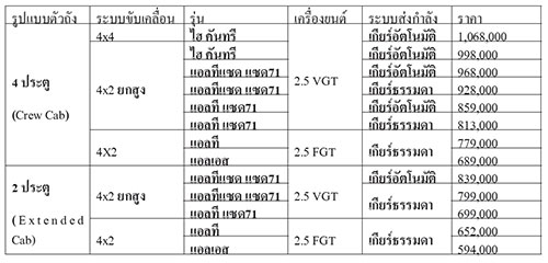 • เครื่องยนต์ดูราแมกซ์ 2.5L VG Turbo ใหม่ ให้กำลังสูงสุด 180 แรงม้าพร้อมแรงบิดสูงสุดถึง 440 นิวตัน-เมตร ที่ 2,000 รอบ/นาที